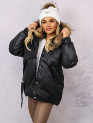KURTKA ASYMETRYCZNA Z NASZYWKĄ NA RĘKAWIE I FUTERKIEM- CZARNA