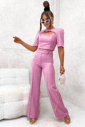 KOMPLET KRÓTKA BLUZKA Z WYCIĘCIEM+ SZEROKIE SPODNIE- RÓŻOWY