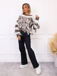 SWETER BEŻOWY W PASKI KOLORU CZEKOLADOWEGO Z FRĘDZLAMI