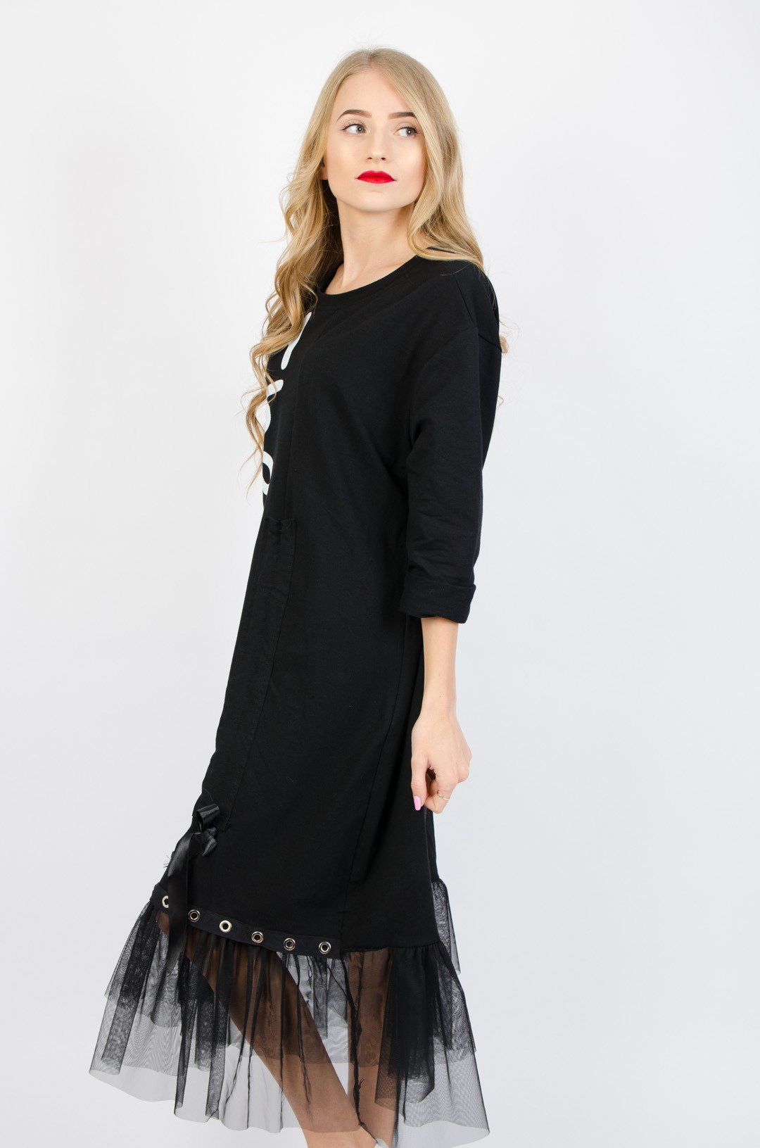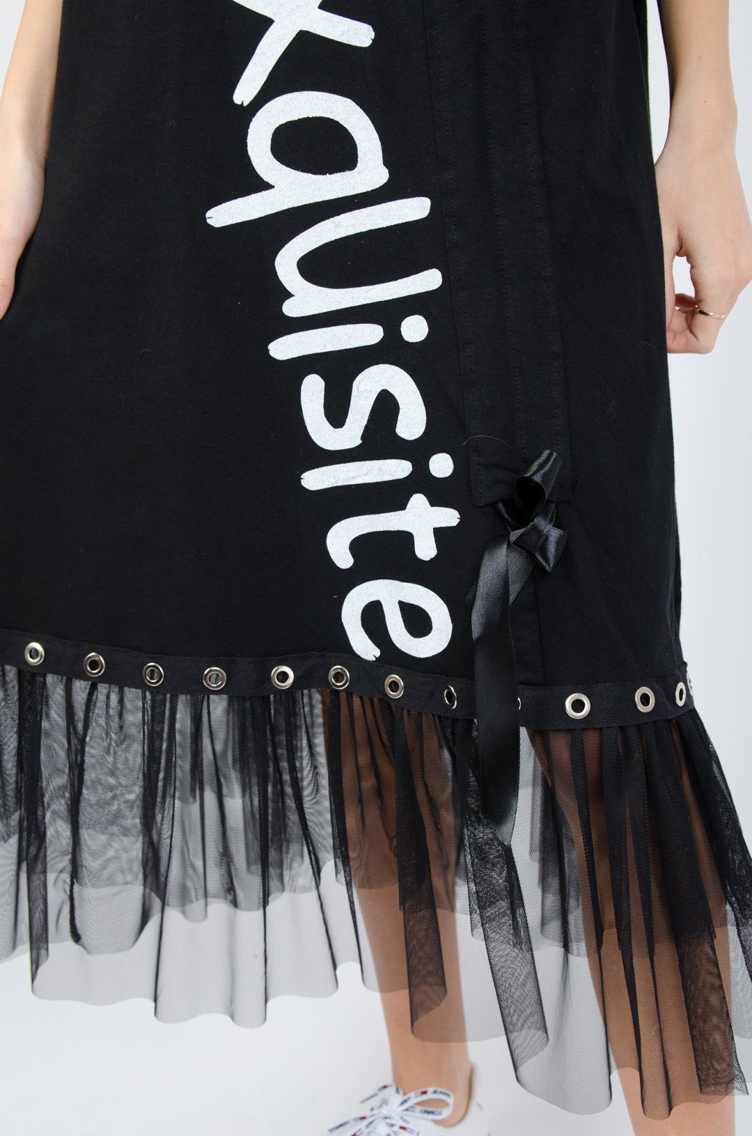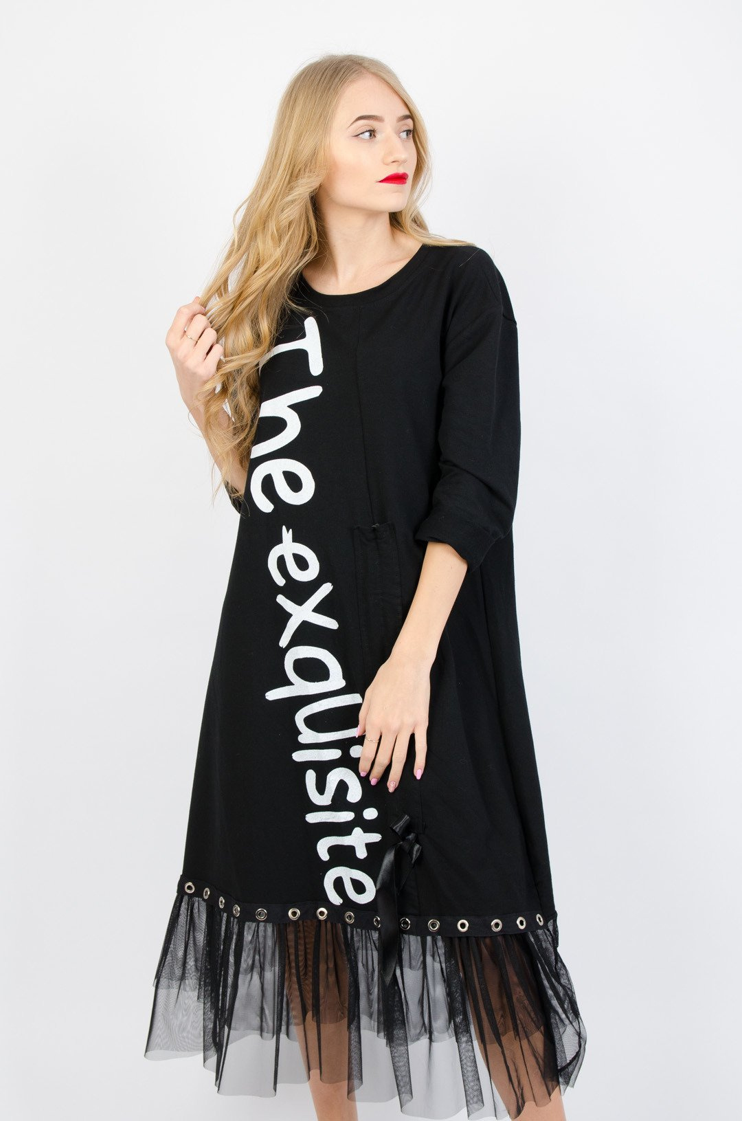 CZARNA SUKIENKA WYKOŃCZONA TIULEM Z NAPISEM
