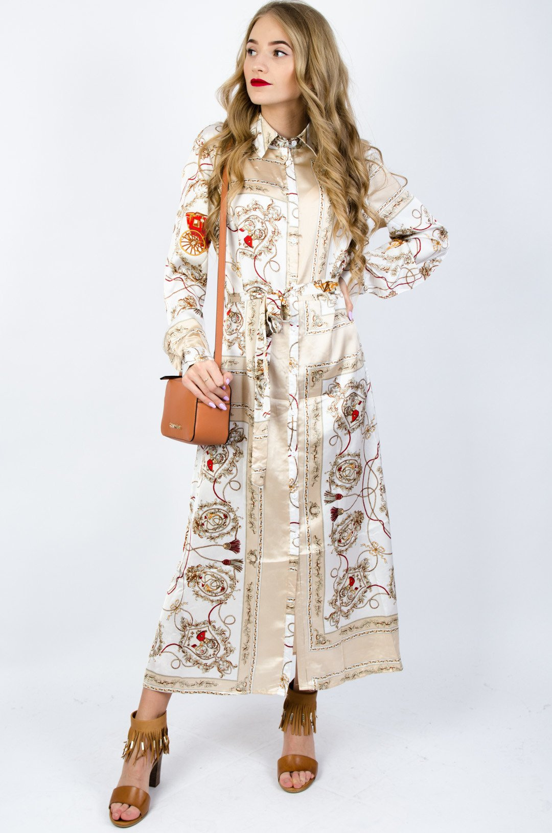 BEŻOWA SATYNOWA SUKIENKA WE WZORY