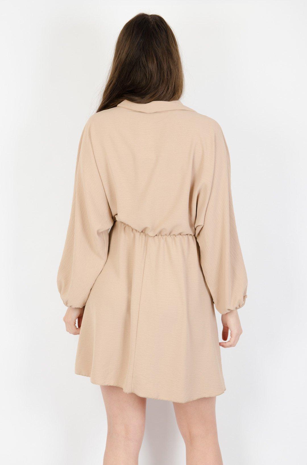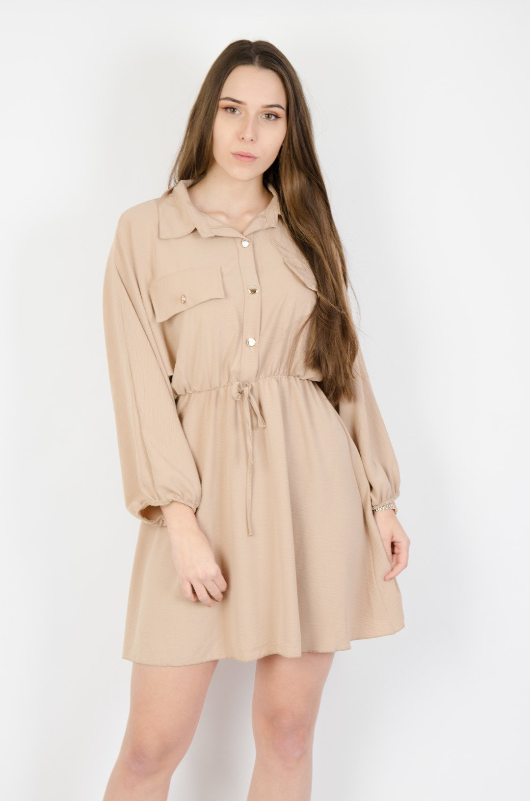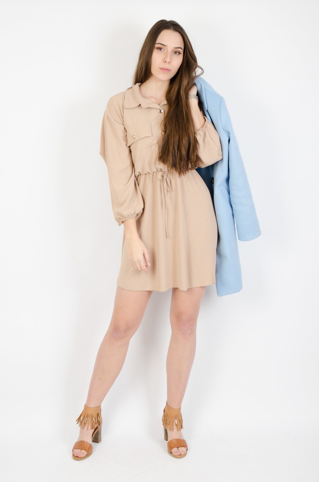 BEŻOWA SUKIENKA Z KREPY ŚCIĄGANA W PASIE