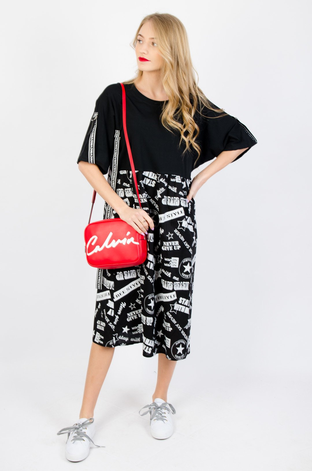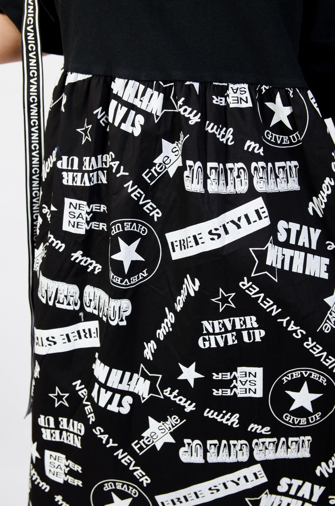 CZARNA ROZKLOSZOWANA SUKIENKA Z NAPISAMI