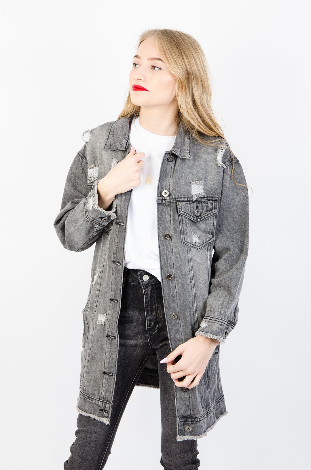 SZARA DŁUGA KURTKA JEANSOWA Z PRZETARCIAMI