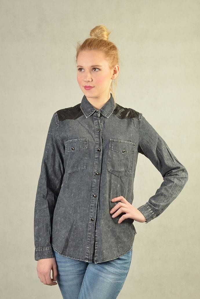 Koszula jeansowa, zapinana na guziki, na rękawach skóra ekologiczna.