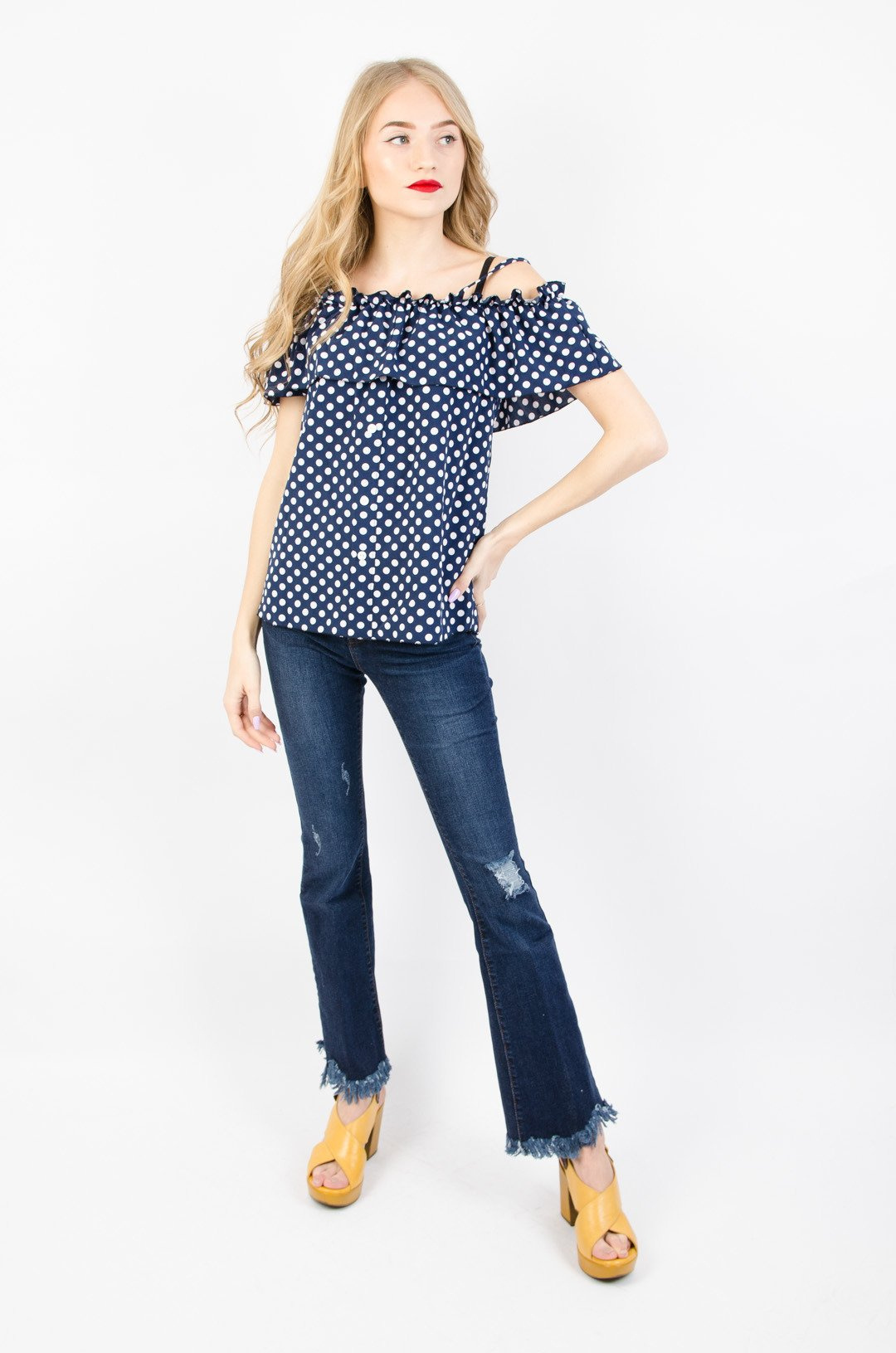 Granatowa bluzka w groszki z hiszpańskim dekoltem