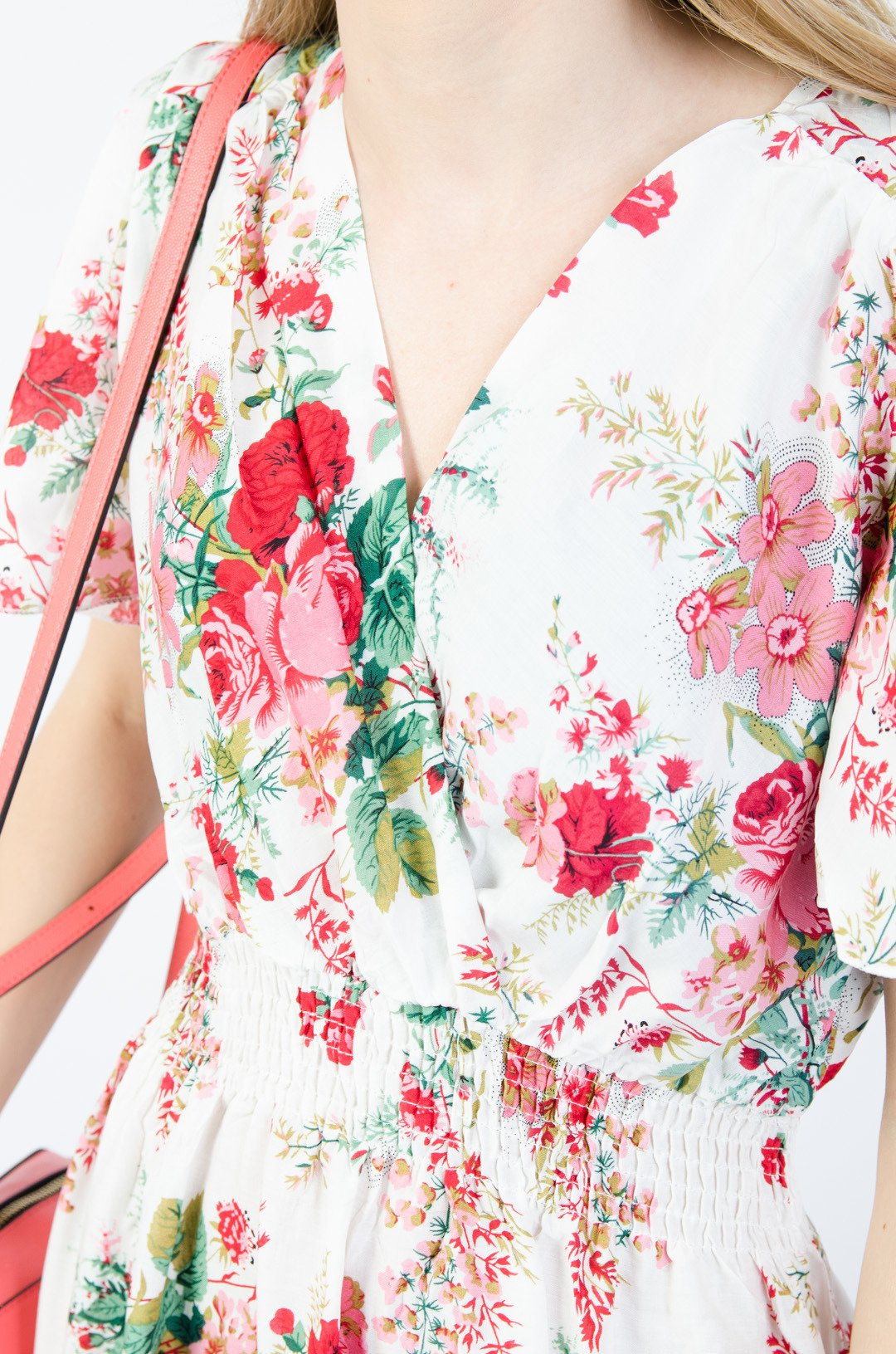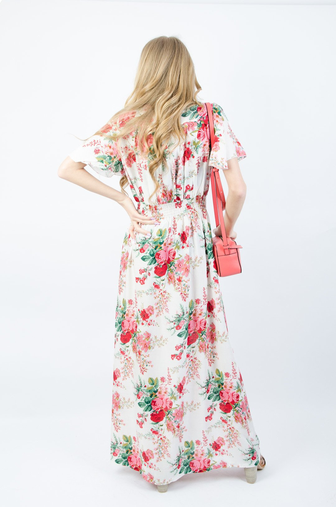Biała długa sukienka w kwiaty z gumą w pasie.