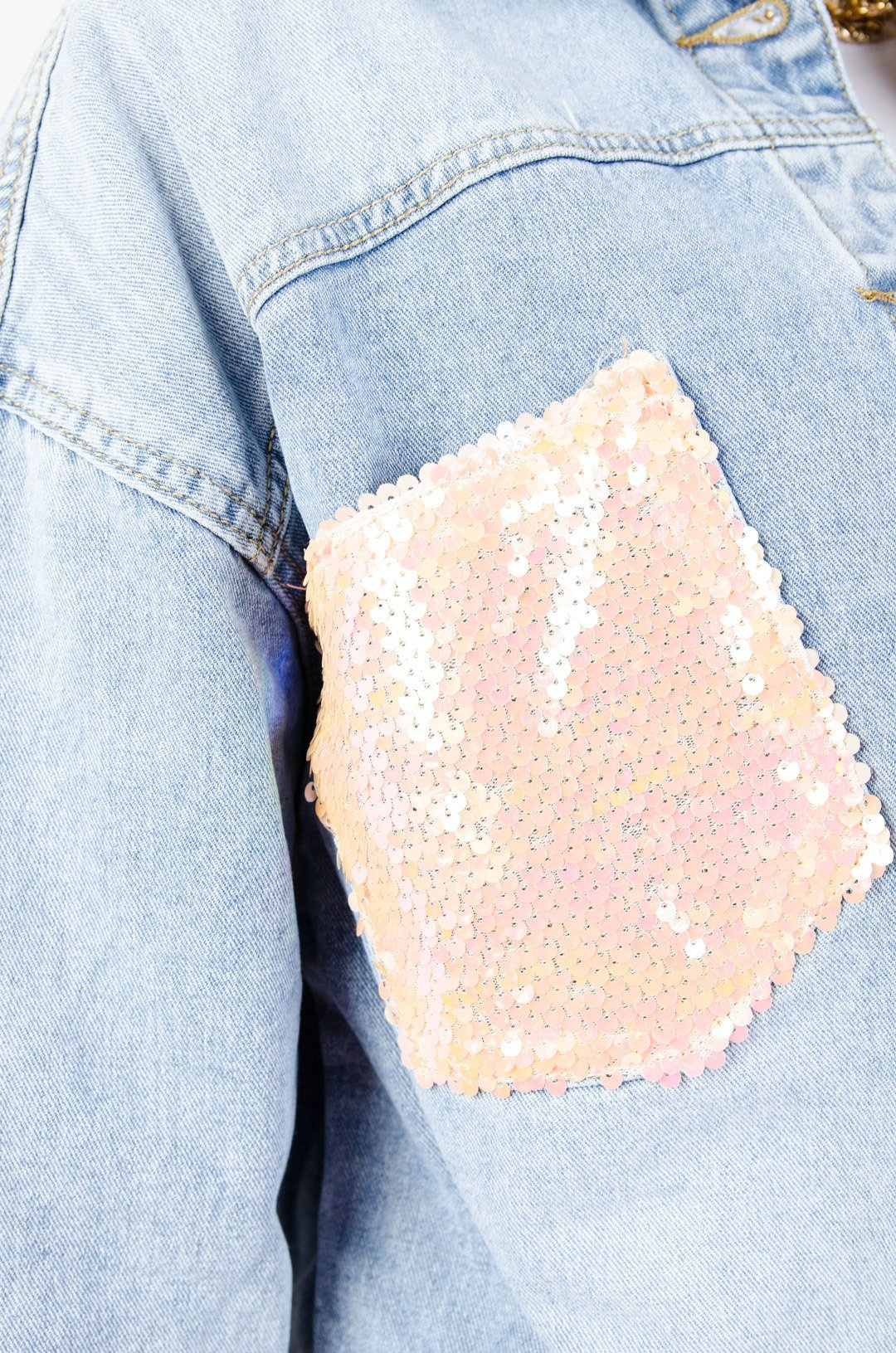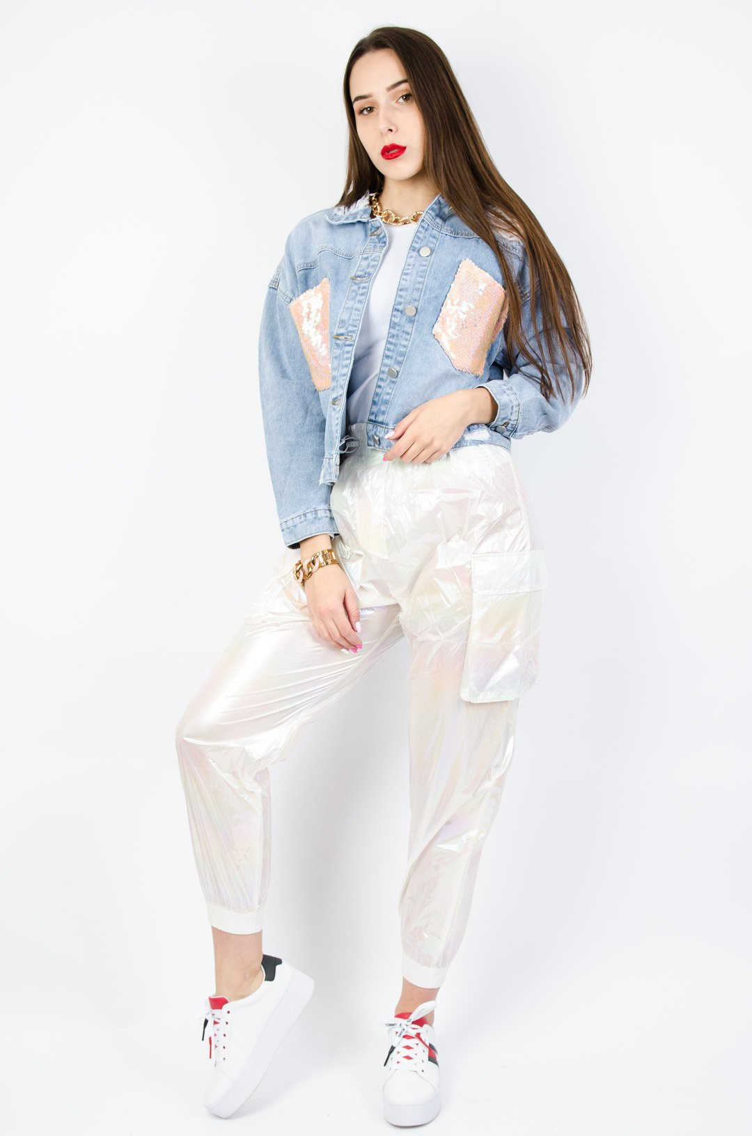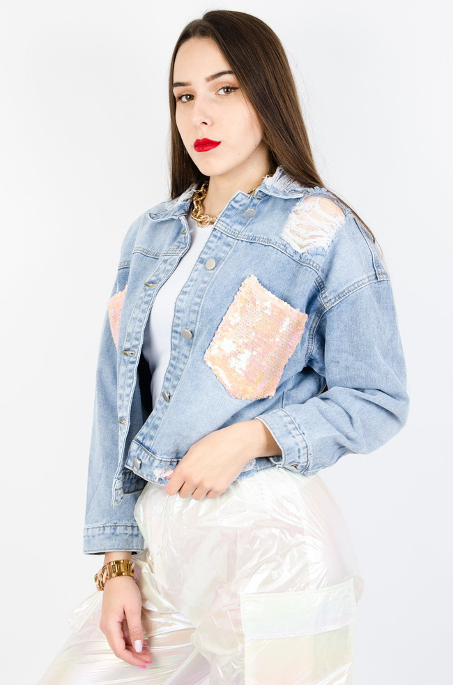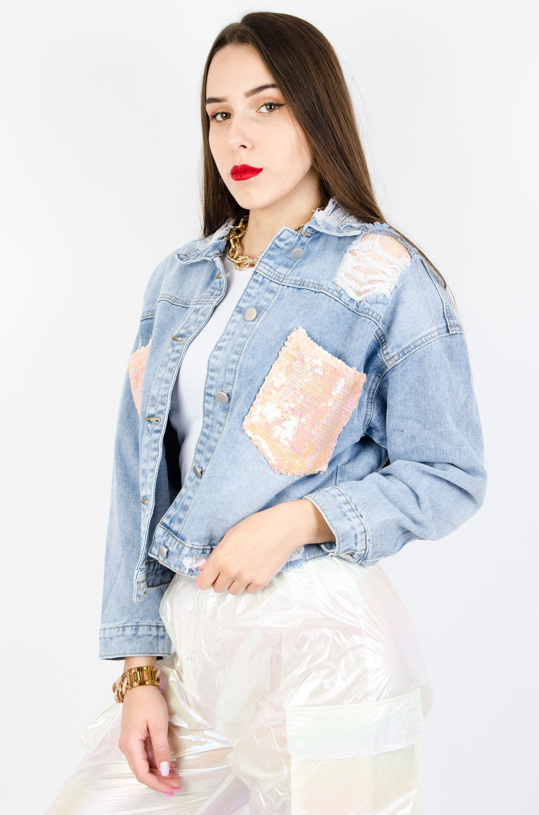 JASNA KURTKA JEANSOWA Z CEKINOWYMI KIESZENIAMI