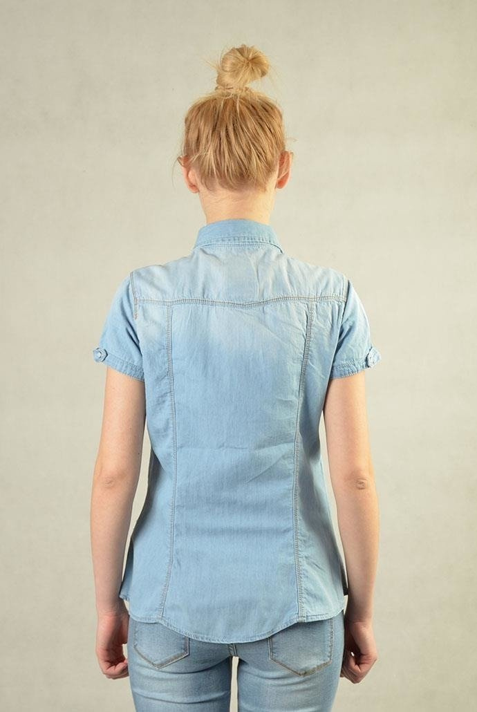 Koszula jeansowa, z krótkim rękawkiem zapinana na zatrzaski. Z przodu dwie kieszonki.