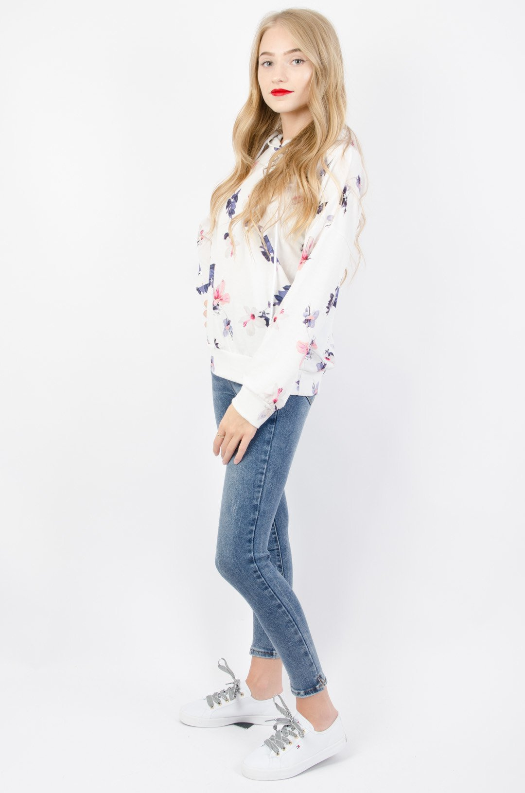 BIAŁA BLUZA Z KAPTUREM Z MOTYWEM KWIATOWYM