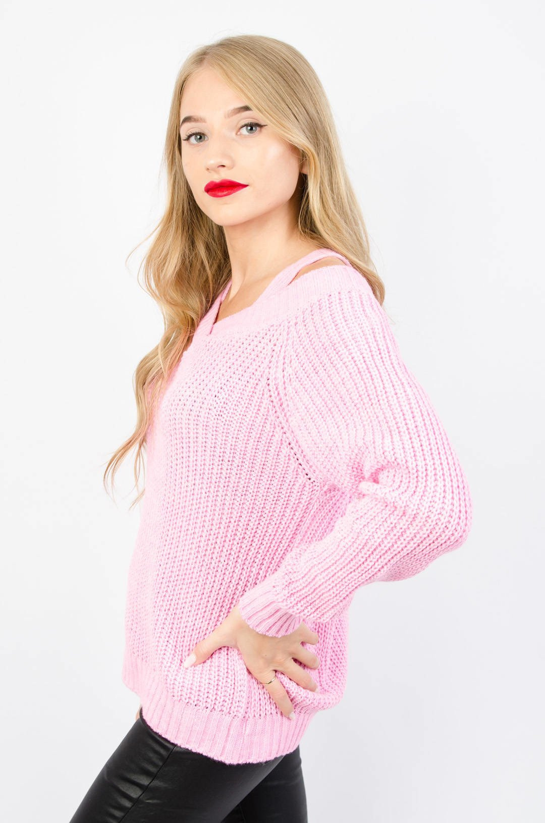 RÓŻOWY SWETER NA RAMIĄCZKACH