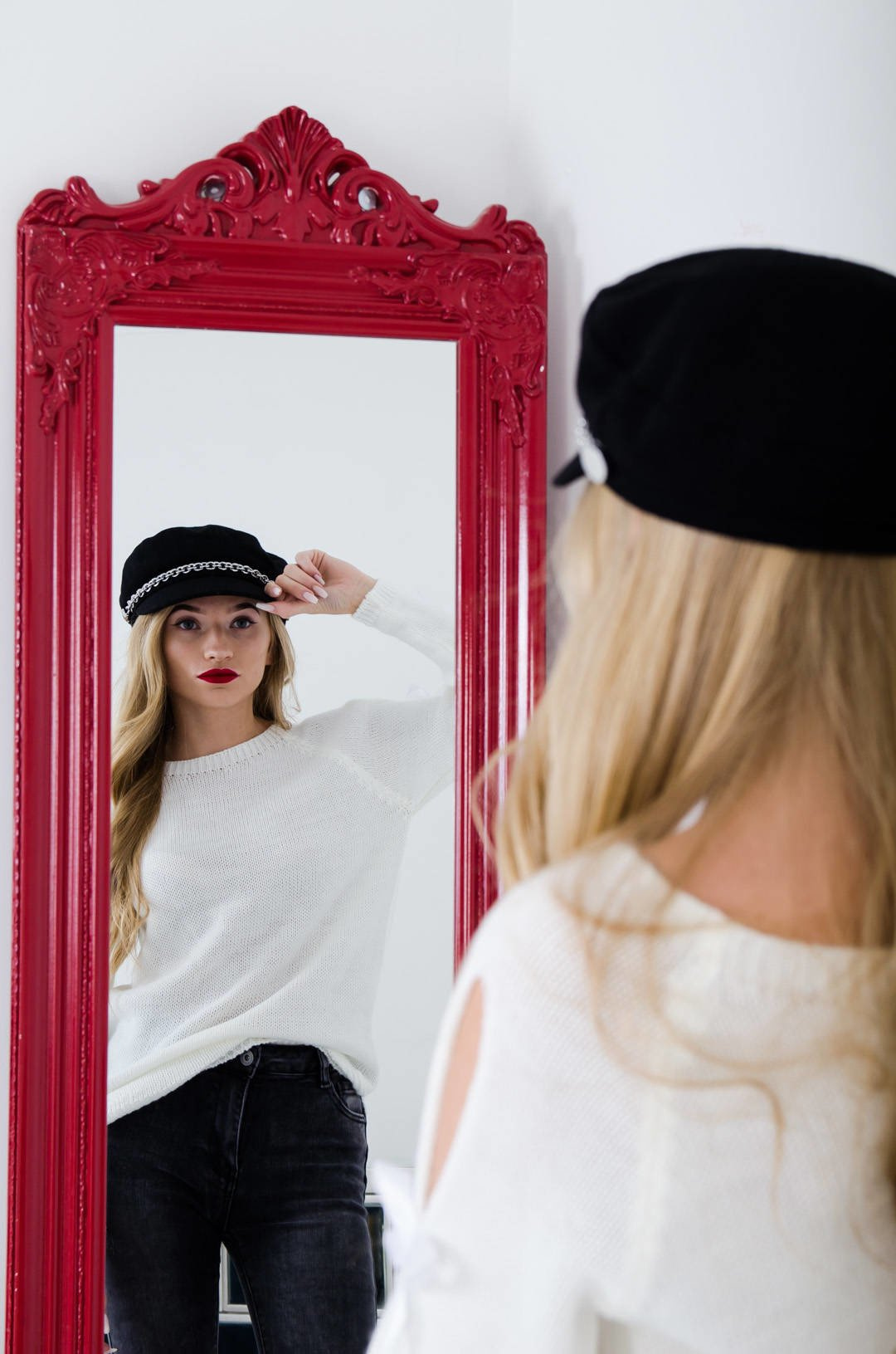 KREMOWY AKRYLOWY SWETER Z WSTĄŻKAMI NA RĘKAWACH