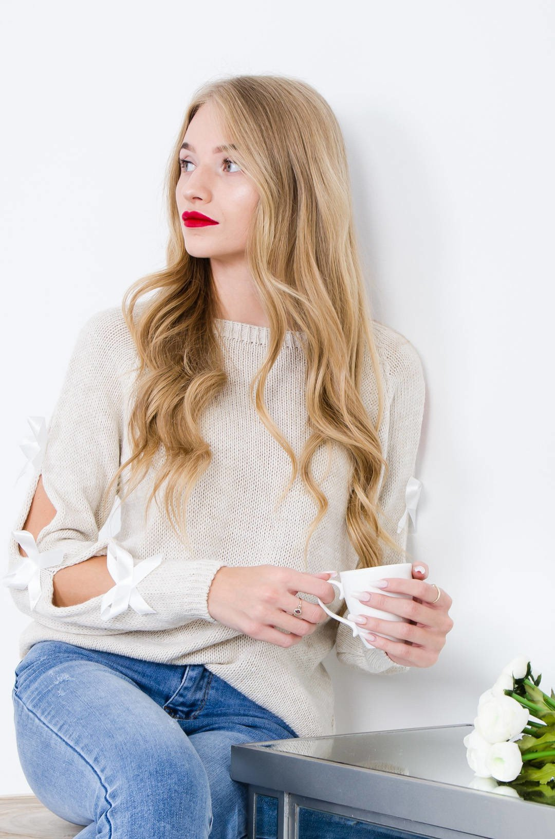 BEŻOWY AKRYLOWY SWETER Z WSTĄŻKAMI NA RĘKAWACH