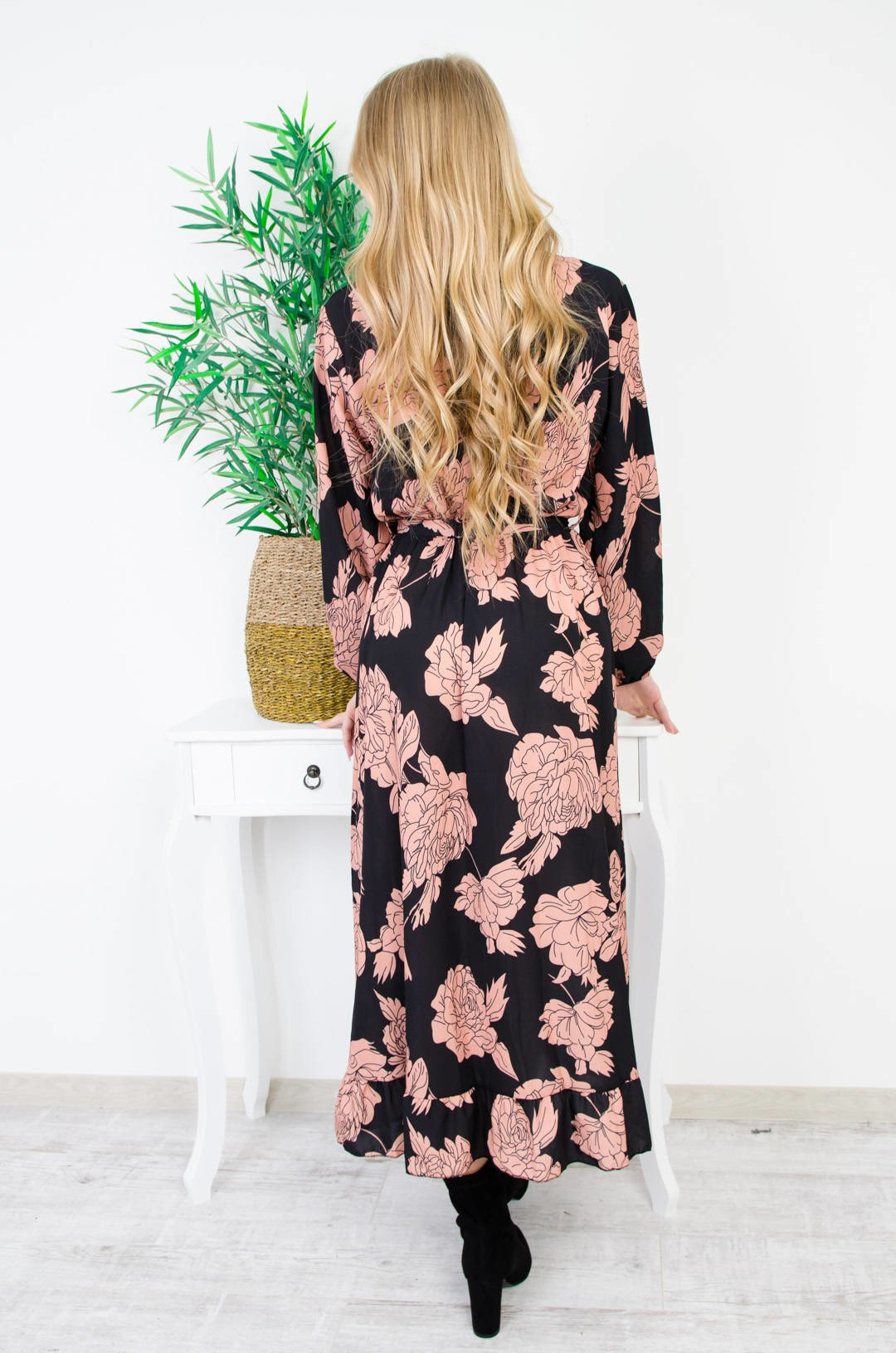 CZARNA ASYMETRYCZNA SUKIENKA W KWIATY Z KOPERTOWYM DEKOLTEM