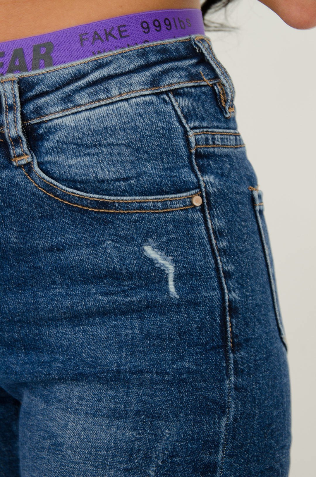 CIEMNE SPODNIE JEANSOWE Z FIOLETOWĄ GUMĄ W PASIE.