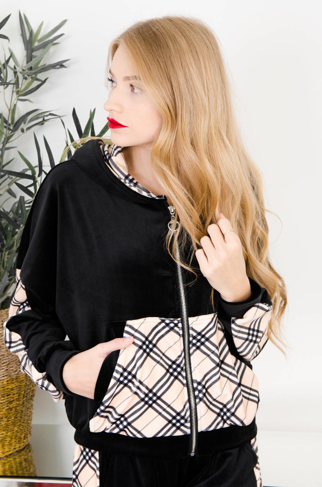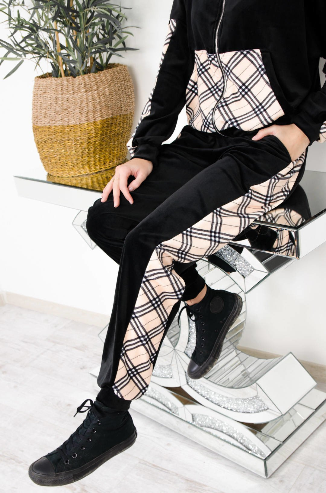 CZARNY WELUROWY DRES Z WSTAWKAMI W KRATĘ