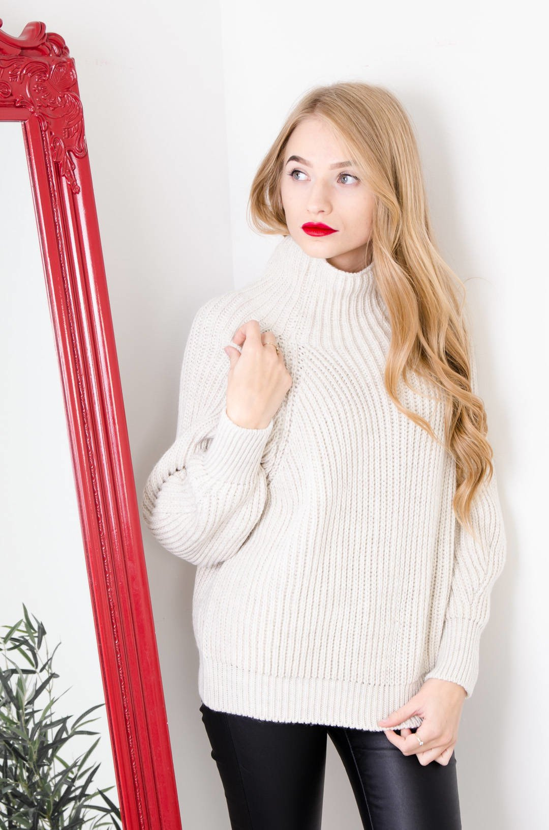 BEŻOWY SWETER OVERSIZE Z PÓŁGOLFEM