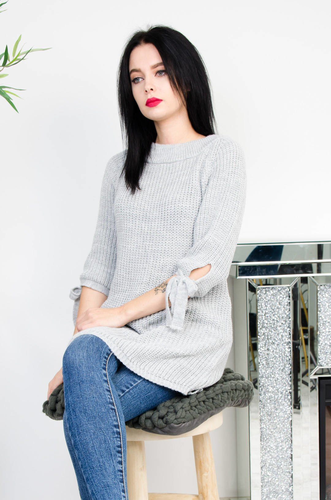 DŁUGI SZARY SWETER-SUKIENKA Z WIĄZANIEM NA RĘKAWACH