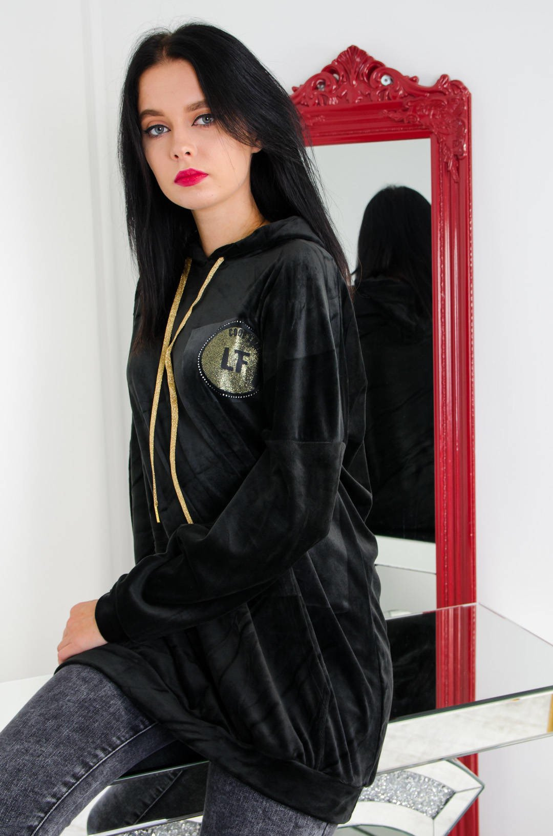CZARNA WELUROWA DŁUGA BLUZA Z NASZYWKĄ