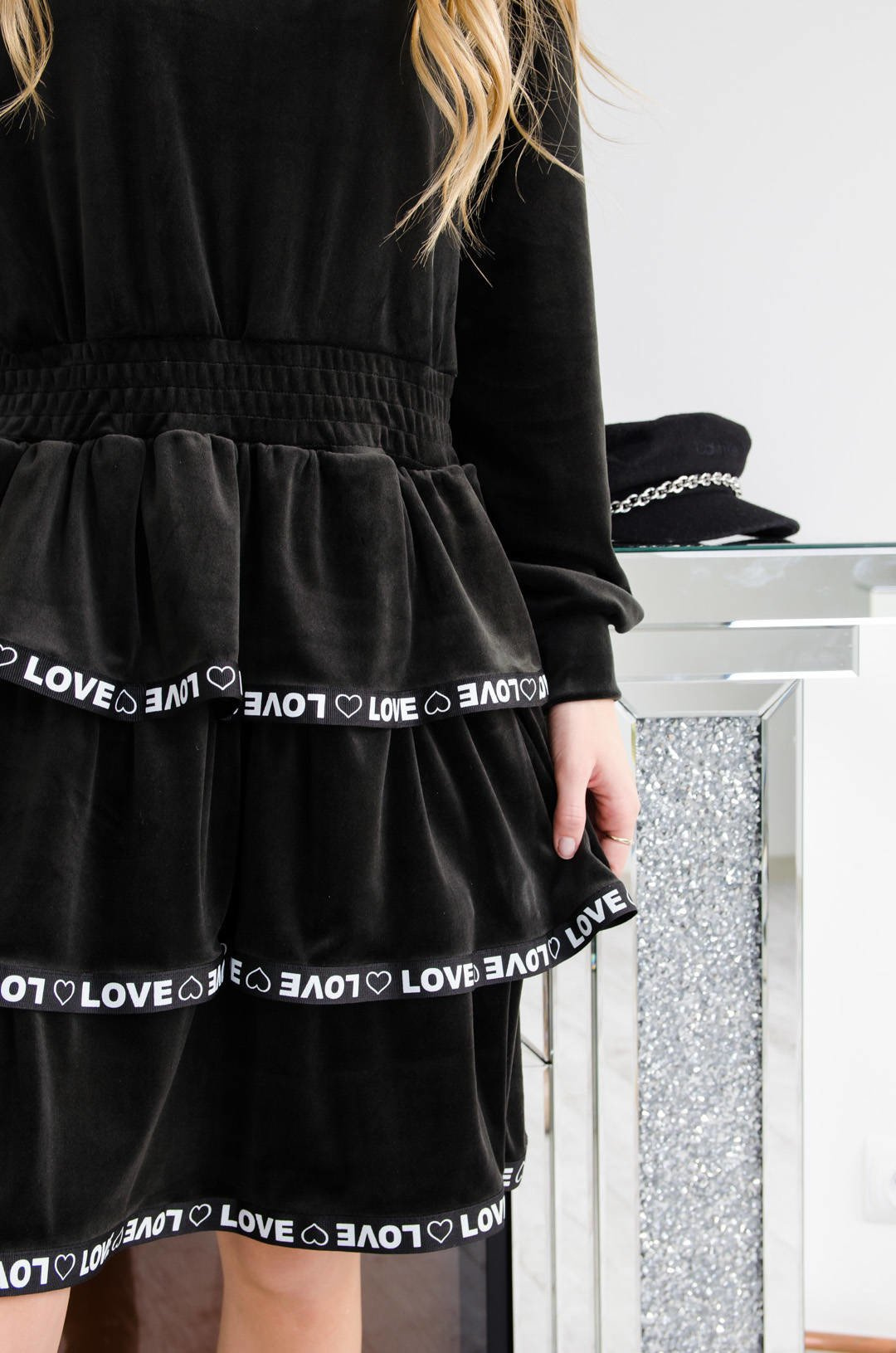 CZARNA WELUROWA SUKIENKA Z FALBANAMI