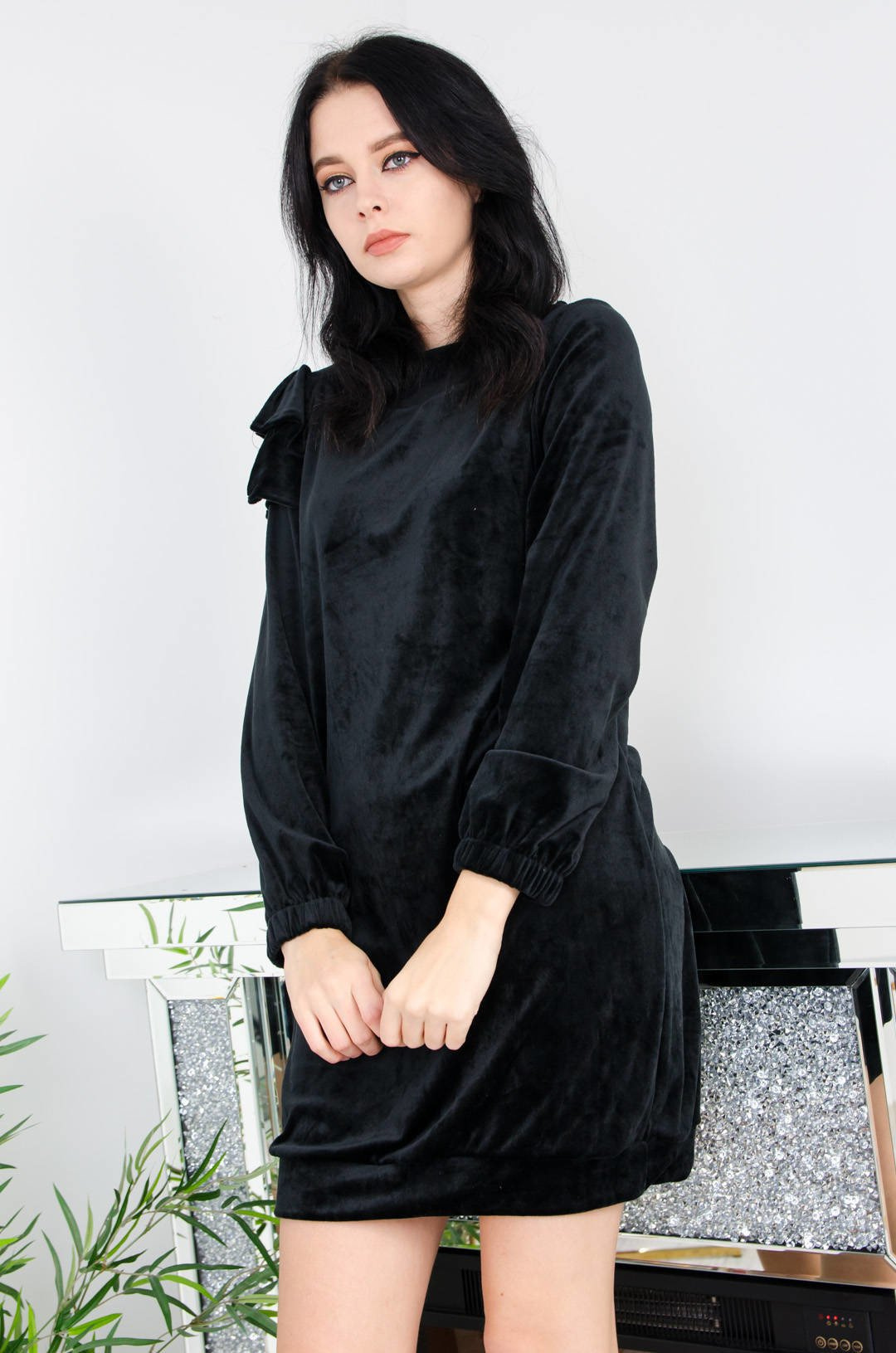 CZARNA WELUROWA SUKIENKA Z FALBANĄ NA RAMIENIU