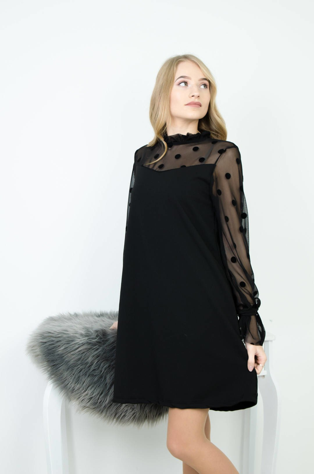 CZARNA SUKIENKA Z TIULOWĄ GÓRĄ I RĘKAWAMI W GROCHY