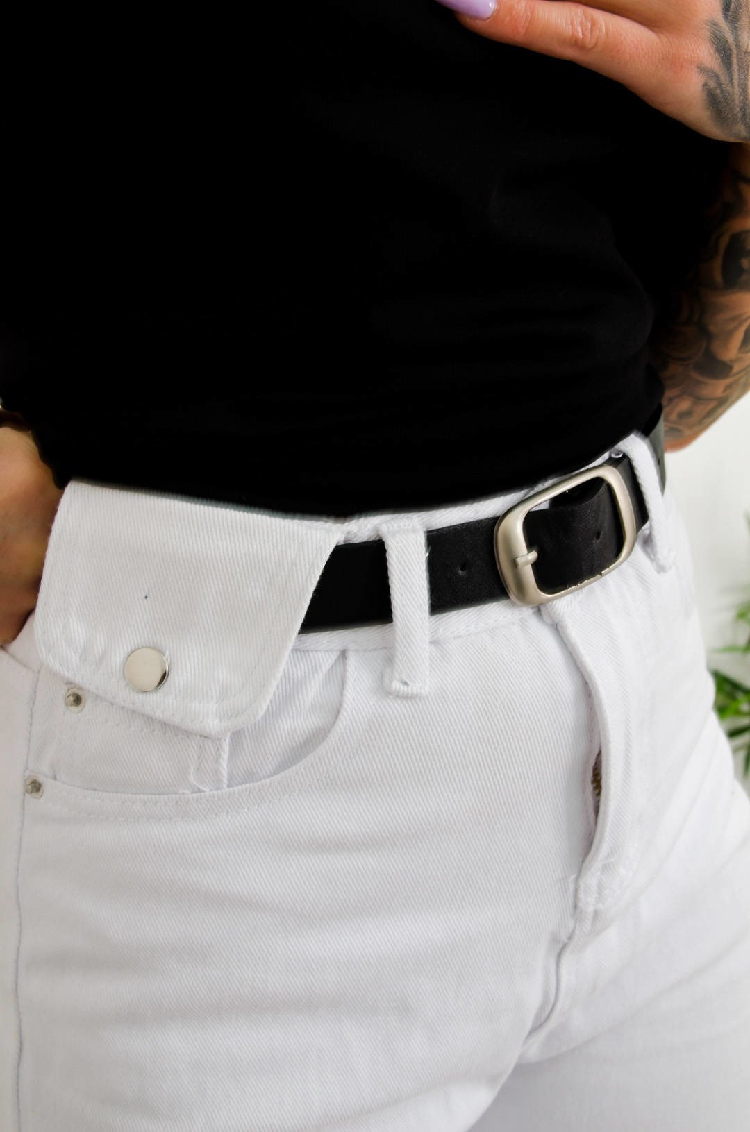 BIAŁE SPODNIE MOM FIT Z PRZETARCIAMI + PASEK