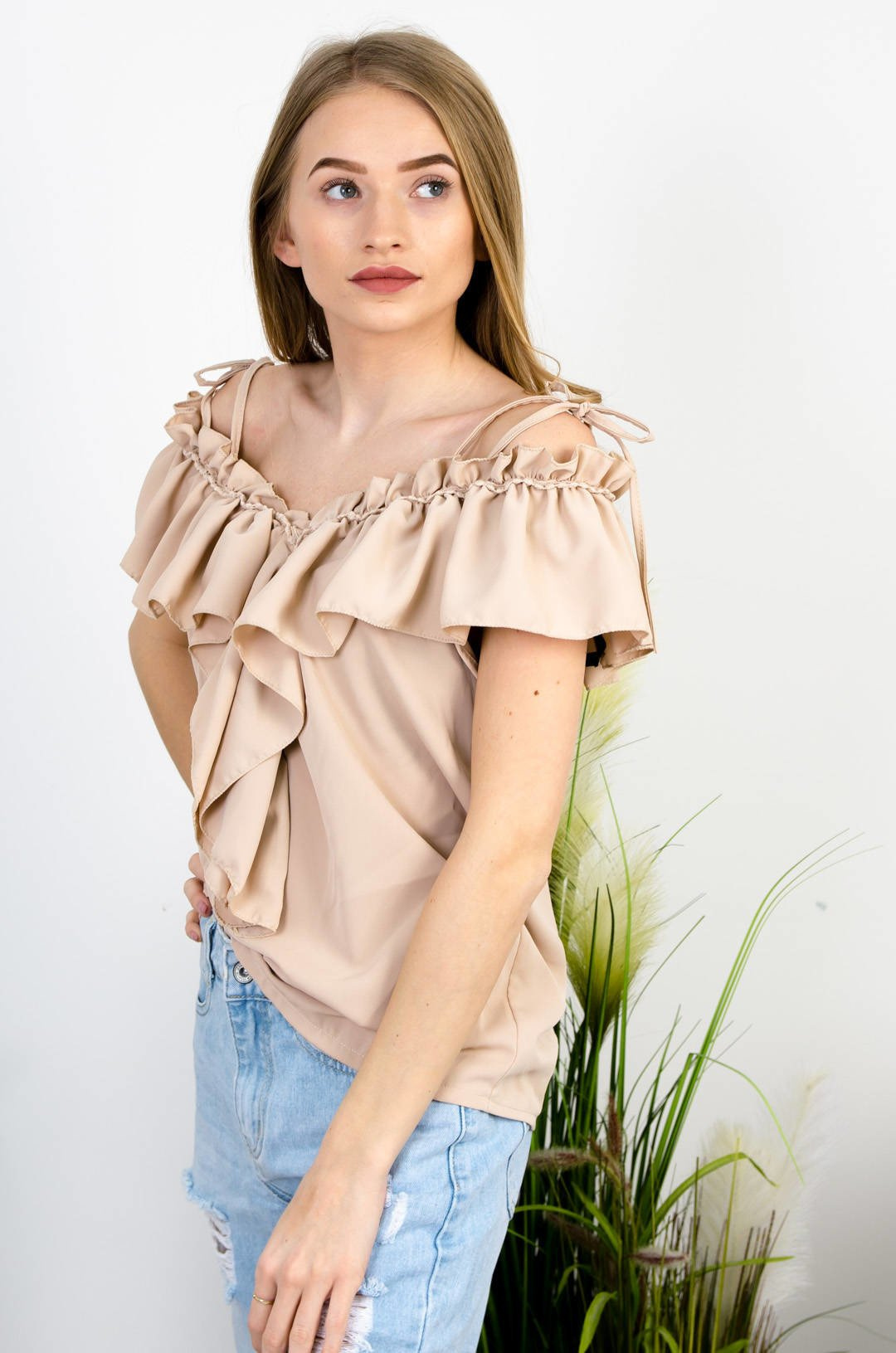 BEŻOWA BLUZKA NA RAMIĄCZKA Z OZDOBNYM ŻABOTEM