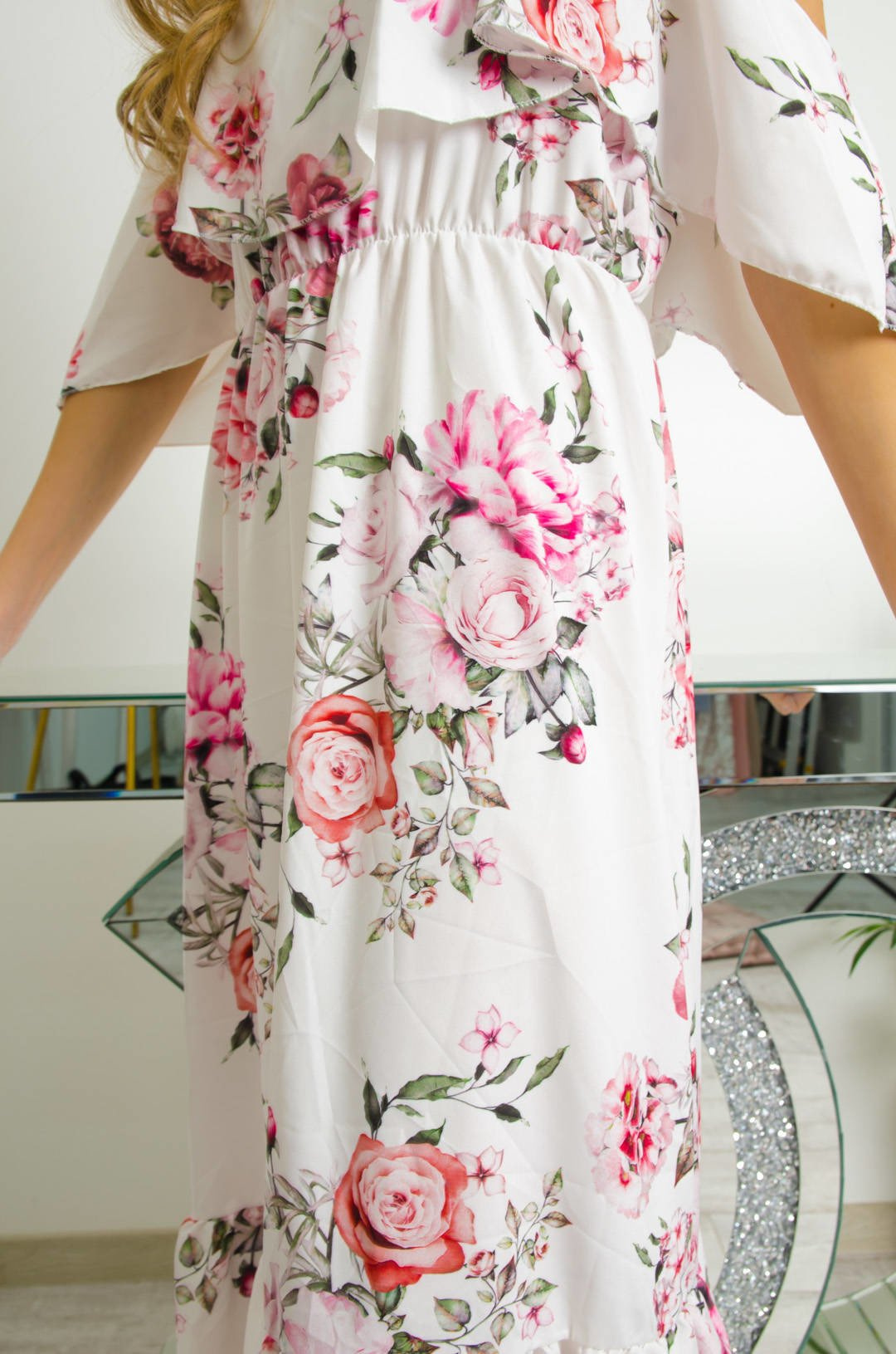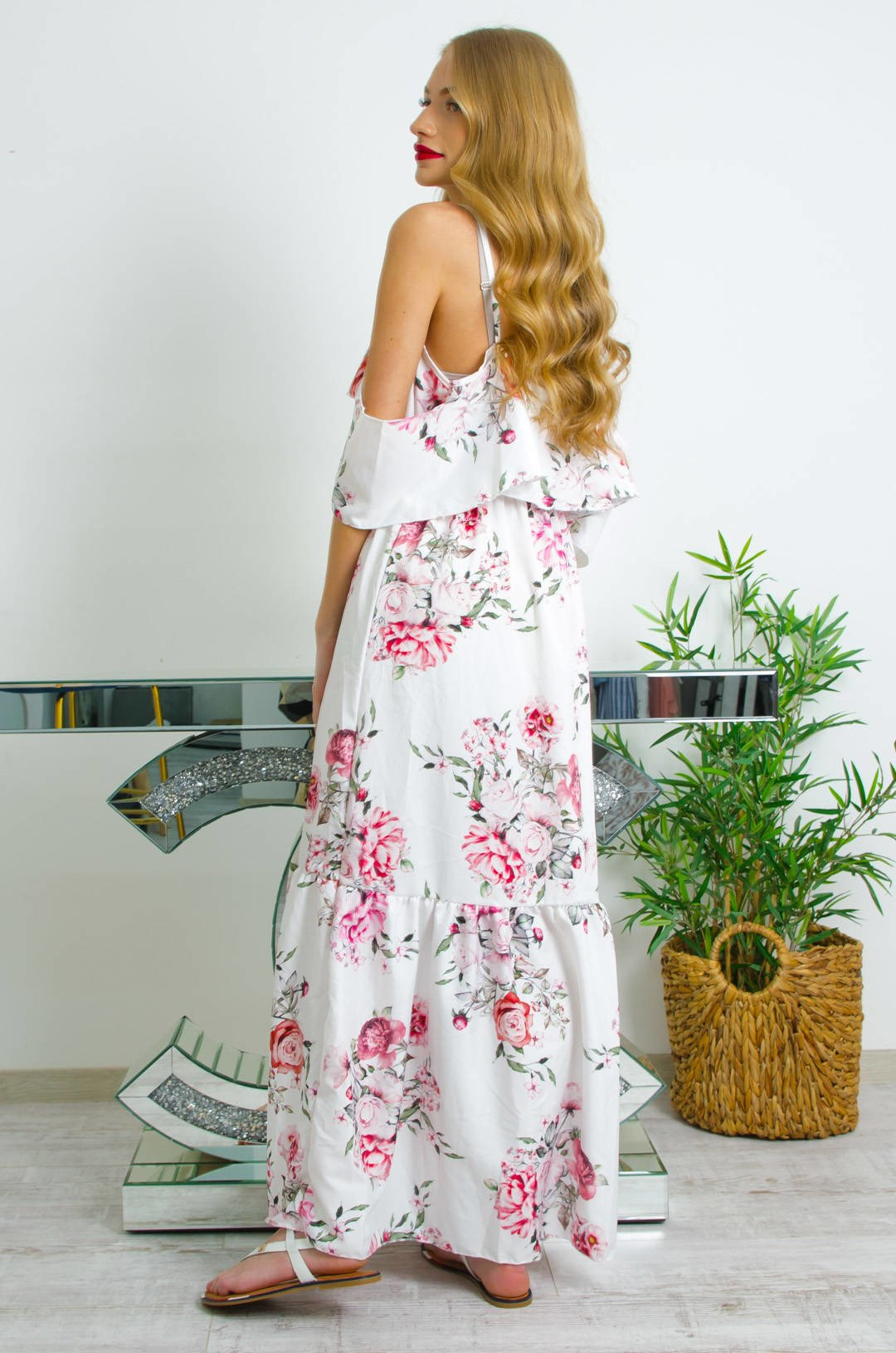 DŁUGA BIAŁA SUKIENKA W KWIATY NA CIENKICH RAMIĄCZKACH MAXI