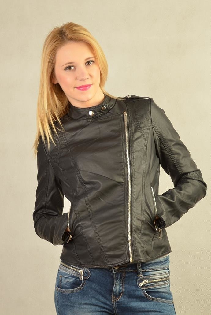 Stylowa ramoneska, zapinana po boku na suwak. Z przodu dwie zapinane kieszenie, na rękawach zamki .
