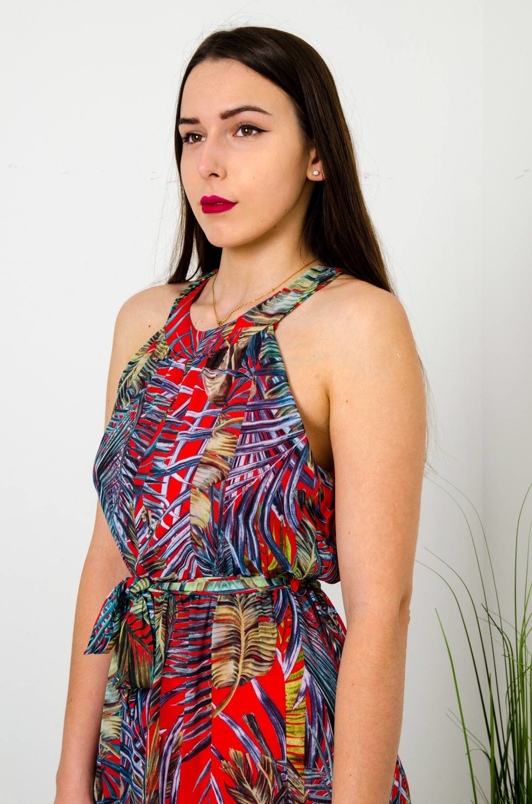 DŁUGA CZERWONO-ZIELONA SUKIENKA MAXI W KWIATOWY WZÓR