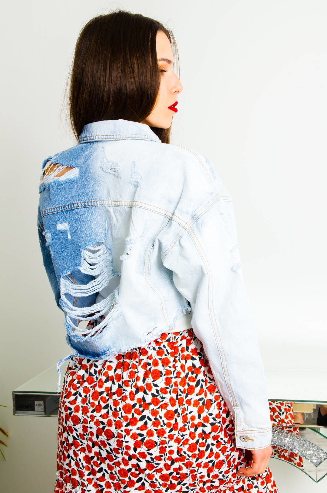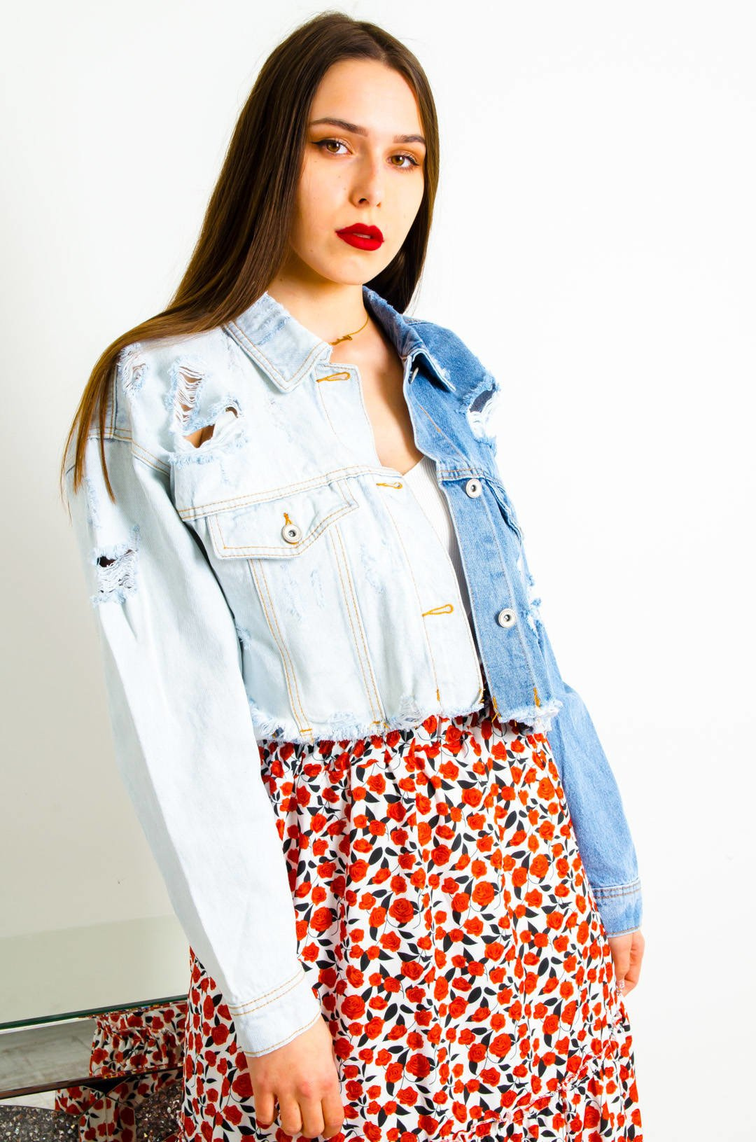 KRÓTKA DWUKOLOROWA KURTKA JEANSOWA Z SZARPANIAMI  (XS-L)