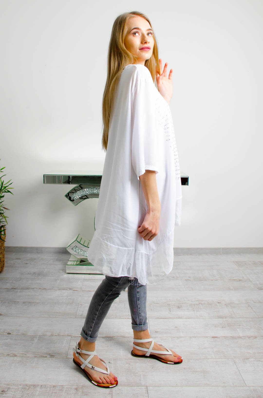 BIAŁA BLUZKA OVERSIZE , SREBRNO-ZŁOTA APLIKACJA