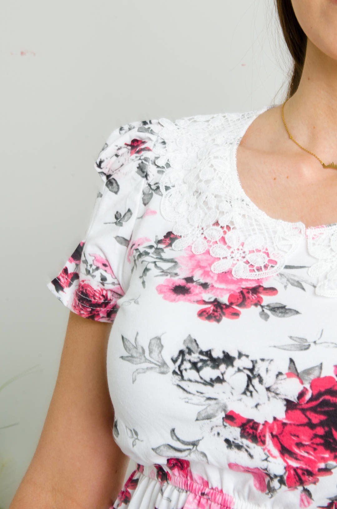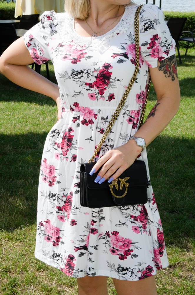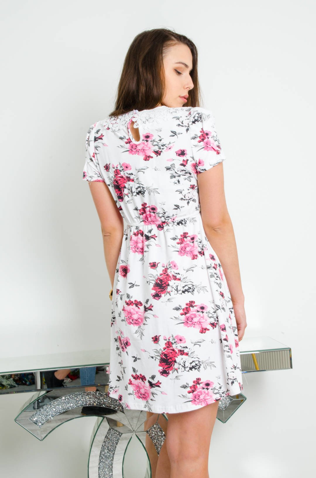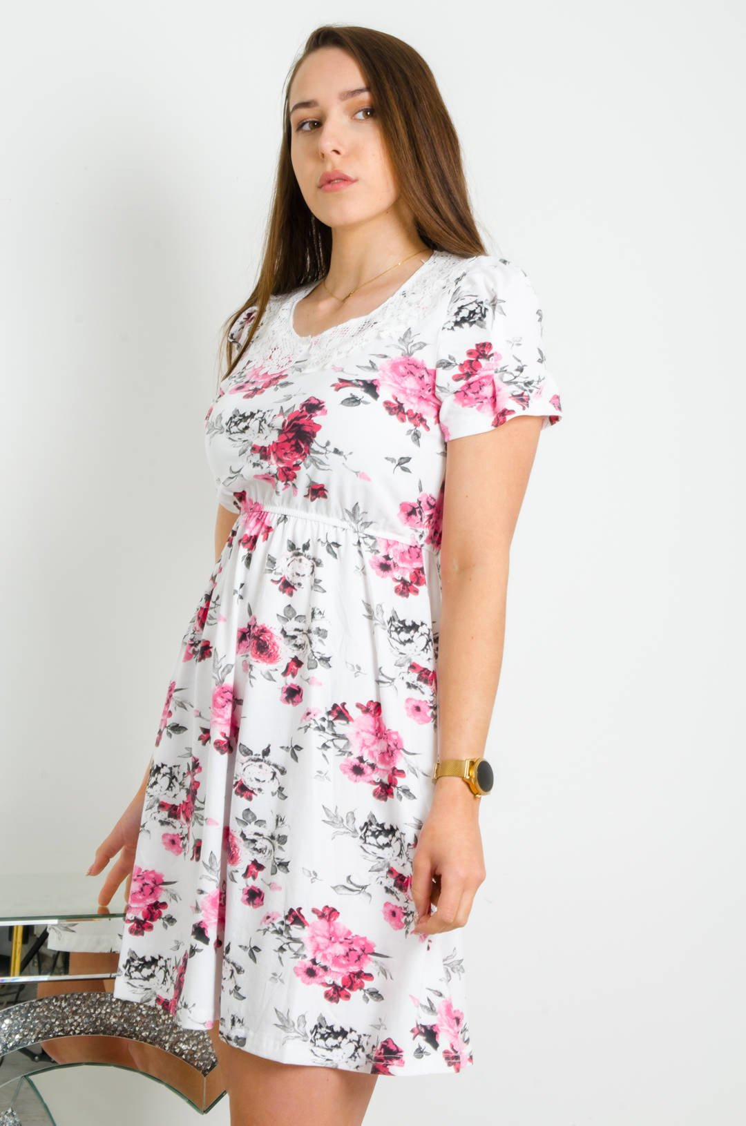 BIAŁO-CZERWONA SUKIENKA W KWIATY Z AŻUROWYM KOŁNIERZEM
