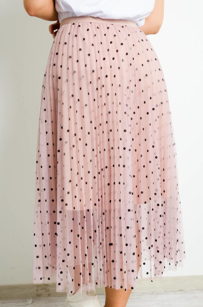 RÓŻOWA PLISOWANA SPÓDNICA MIDI Z TIULU W CZARNE KROPKI