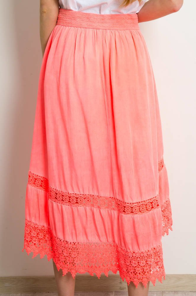 SPÓDNICA MIDI Z GUMĄ W PASIE ORAZ AŻUROWYM WYKOŃCZENIEM.