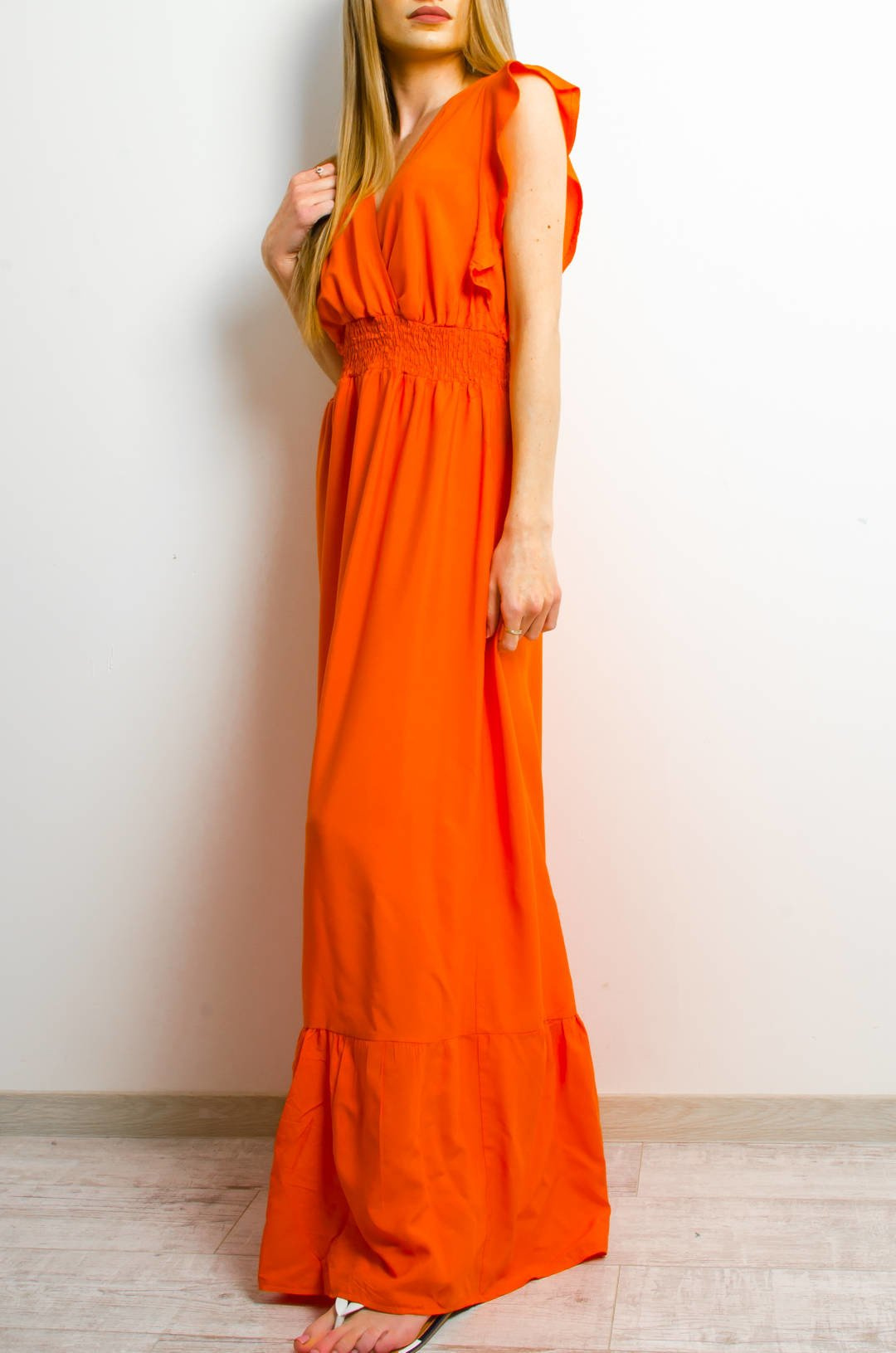DŁUGA POMARAŃCZOWA SUKIENKA Z KOPERTOWYM DEKOLTEM