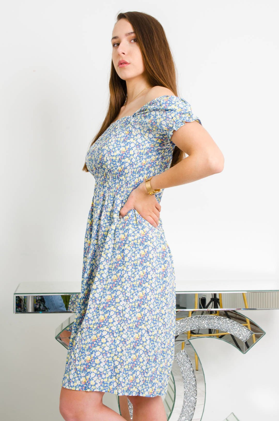 NIEBIESKA SUKIENKA W KWIATY Z BUFKAMI
