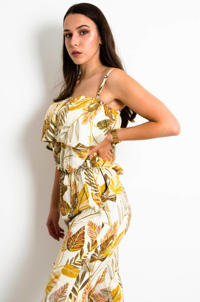 BEŻOWY KOMBINEZON W KWIATY Z HISZPAŃSKIM DEKOLTEM