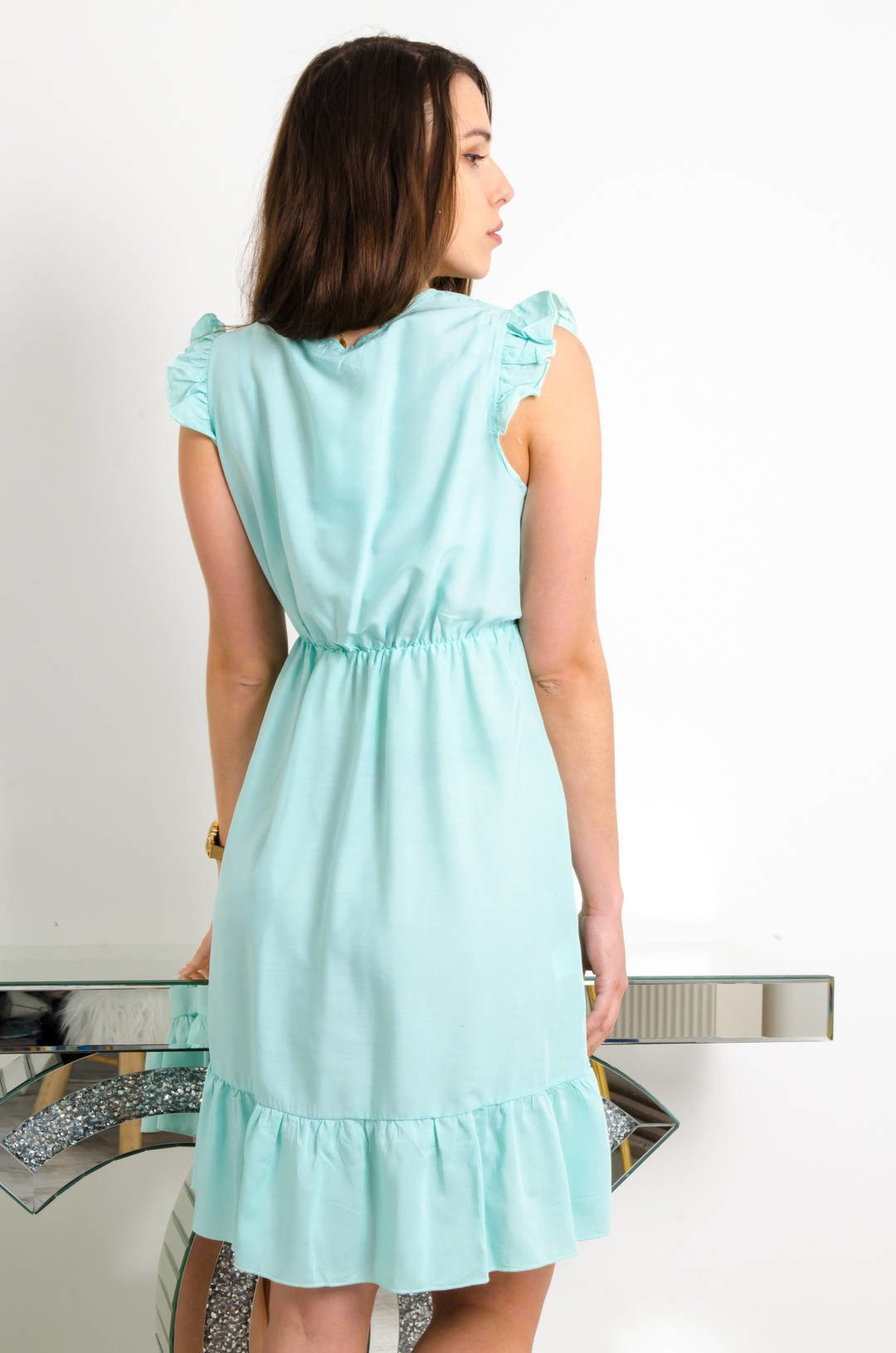 NIEBIESKA KRÓTKA ZWIEWNA SUKIENKA Z KOPERTOWYM DEKOLTEM