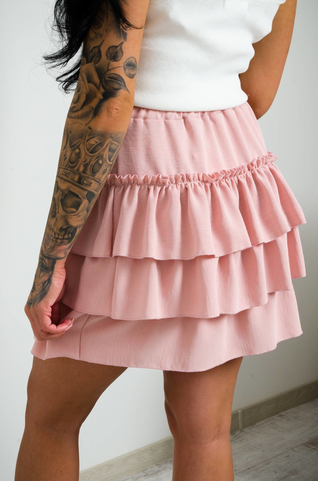 PUDROWO-RÓŻOWA SPÓDNICA MINI Z FALBANAMI