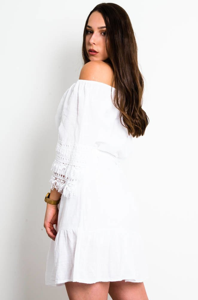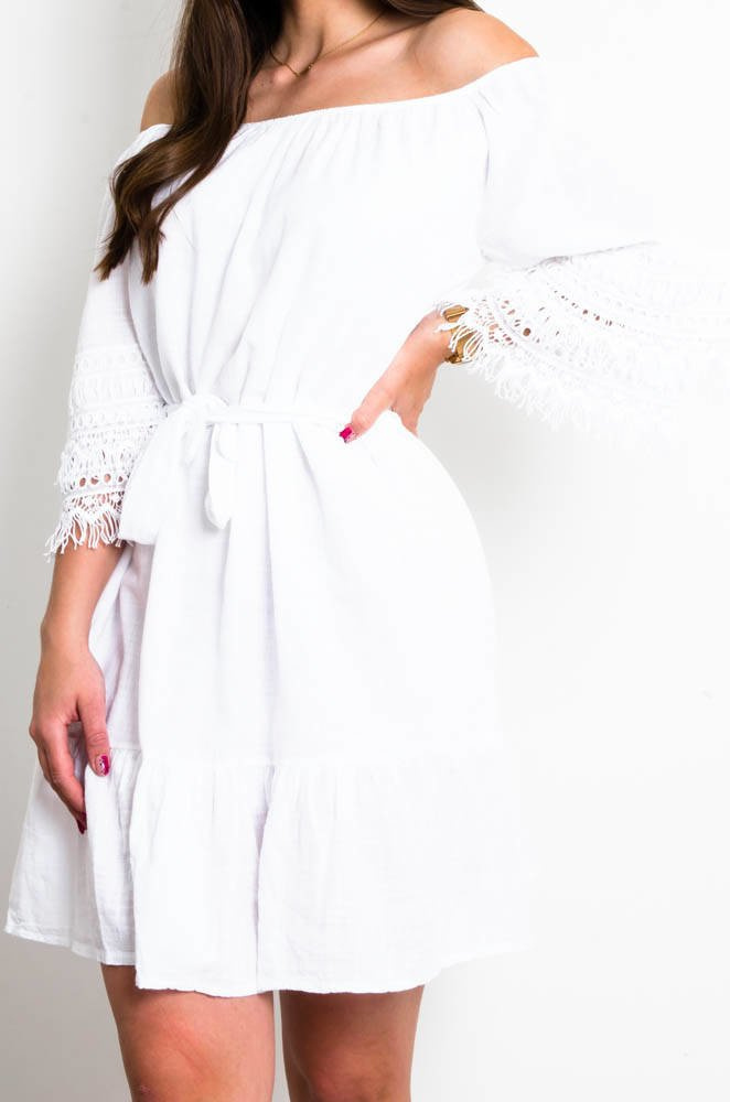 BIAŁA BAWEŁNIANA SUKIENKA Z AŻUROWYM ZDOBIENIEM NA RĘKAWACH
