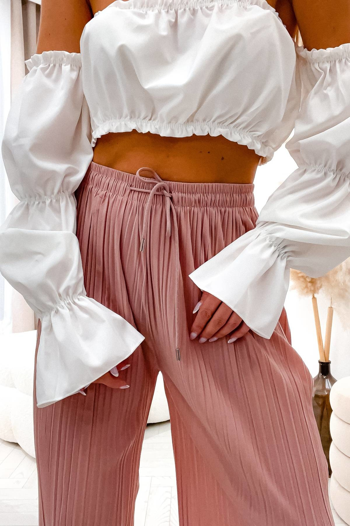 RÓŻOWE SPODNIE Z SZEROKIMI PLISOWANYMI NOGAWKAMI-WYSOKI STAN
