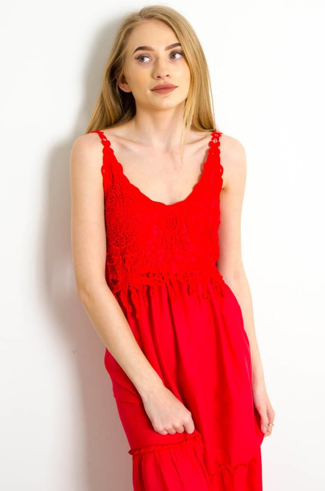 CZERWONA SUKIENKA MAXI NA RAMIĄCZKACH Z AŻUROWĄ GÓRĄ