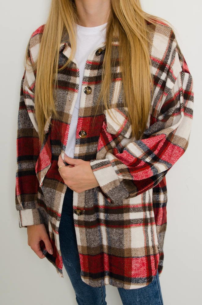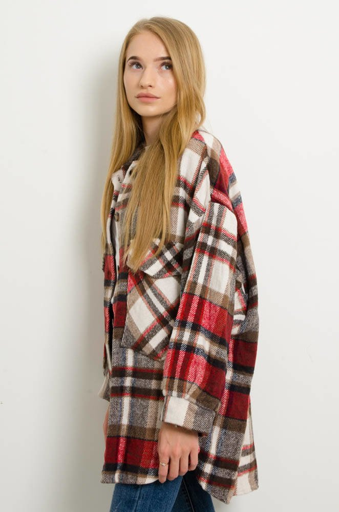 KURTKA KOSZULOWA W KRATĘ - CZERWONA