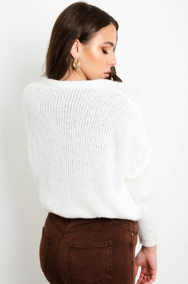 KRÓTKI KARDIGAN SWETER ZAPINANY NA GUZIKI Z DEKOLTEM W SEREK