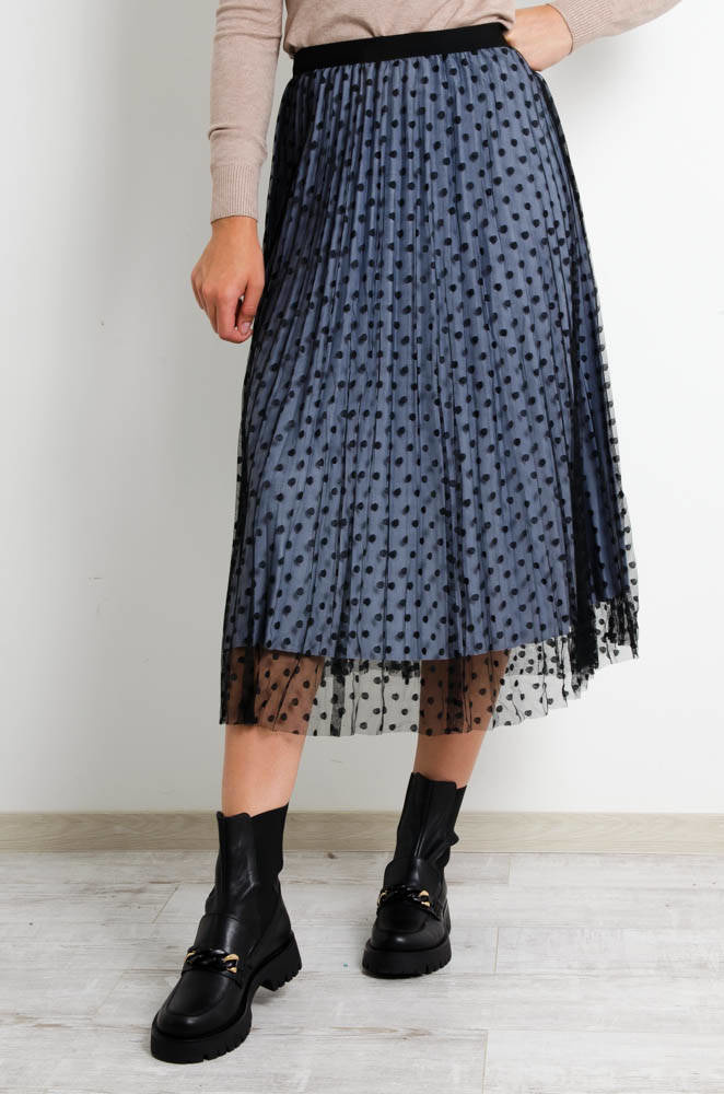SZARA PLISOWANA SPÓDNICA MIDI Z TIULU W CZARNE KROPKI