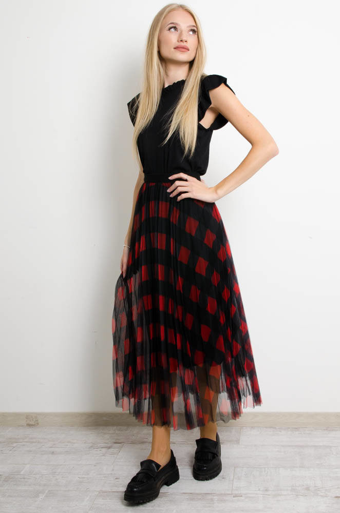 CZERWONA SPÓDNICA TIULOWA W KRATĘ