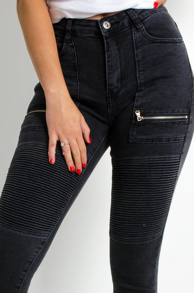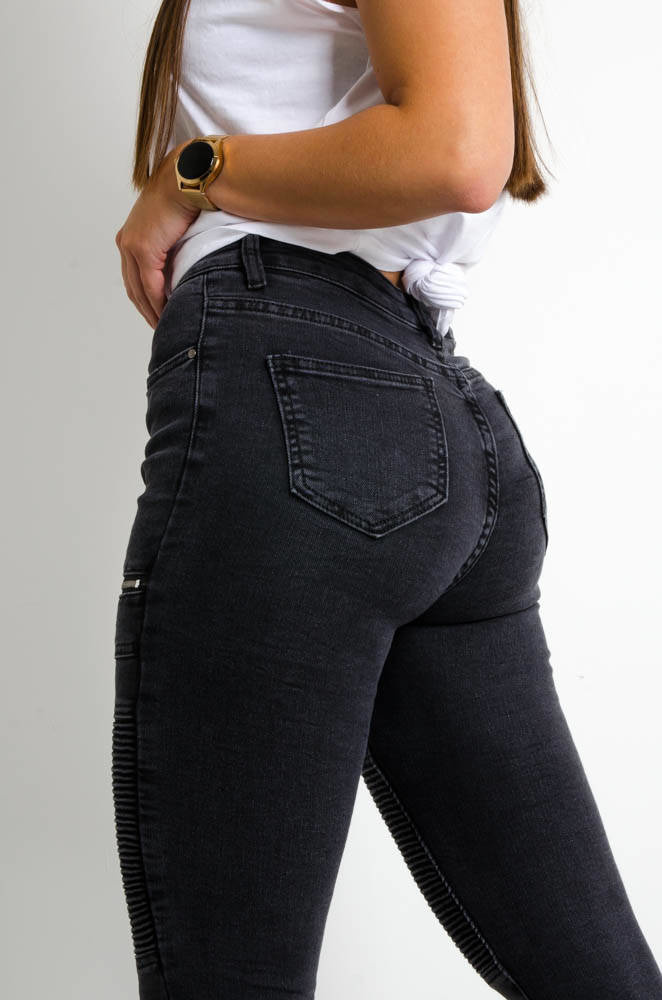 CIEMNO-SZARE SPODNIE JEANSOWE Z ZAMKAMI NA UDACH