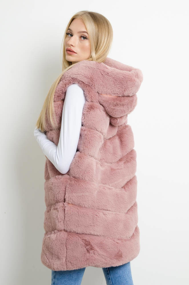 RÓŻOWA FUTRZANA KAMIZELKA Z KAPTUREM